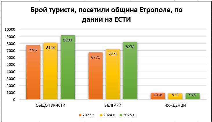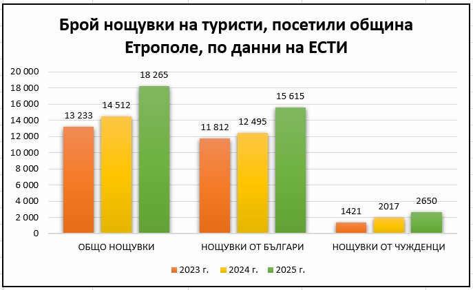 Данните от Единната система за туристическа информация (ЕСТИ) ясно потвърждават тази тенденция – туристическият поток нараства, нощувките се увеличават, а интересът към местните събития и традиции достига безпрецедентни нива. Така например, броят на туристите, посетили Етрополе през 2023 г. е 7 787, а през 2025 г. вече са 9203 души. Наблюдава се също така, че посетителите все повече предпочитат да останат за няколко дни в балканското градче и статистиката от ЕСТИ го доказва – през 2023 г. реализираните нощувки са били 13 233, докато през 2025 г. вече са 18 265. Това допринася не само за популяризирането на община Етрополе, но и за развитието на местната икономика, местата за настаняване и заведенията за хранене и развлечения.